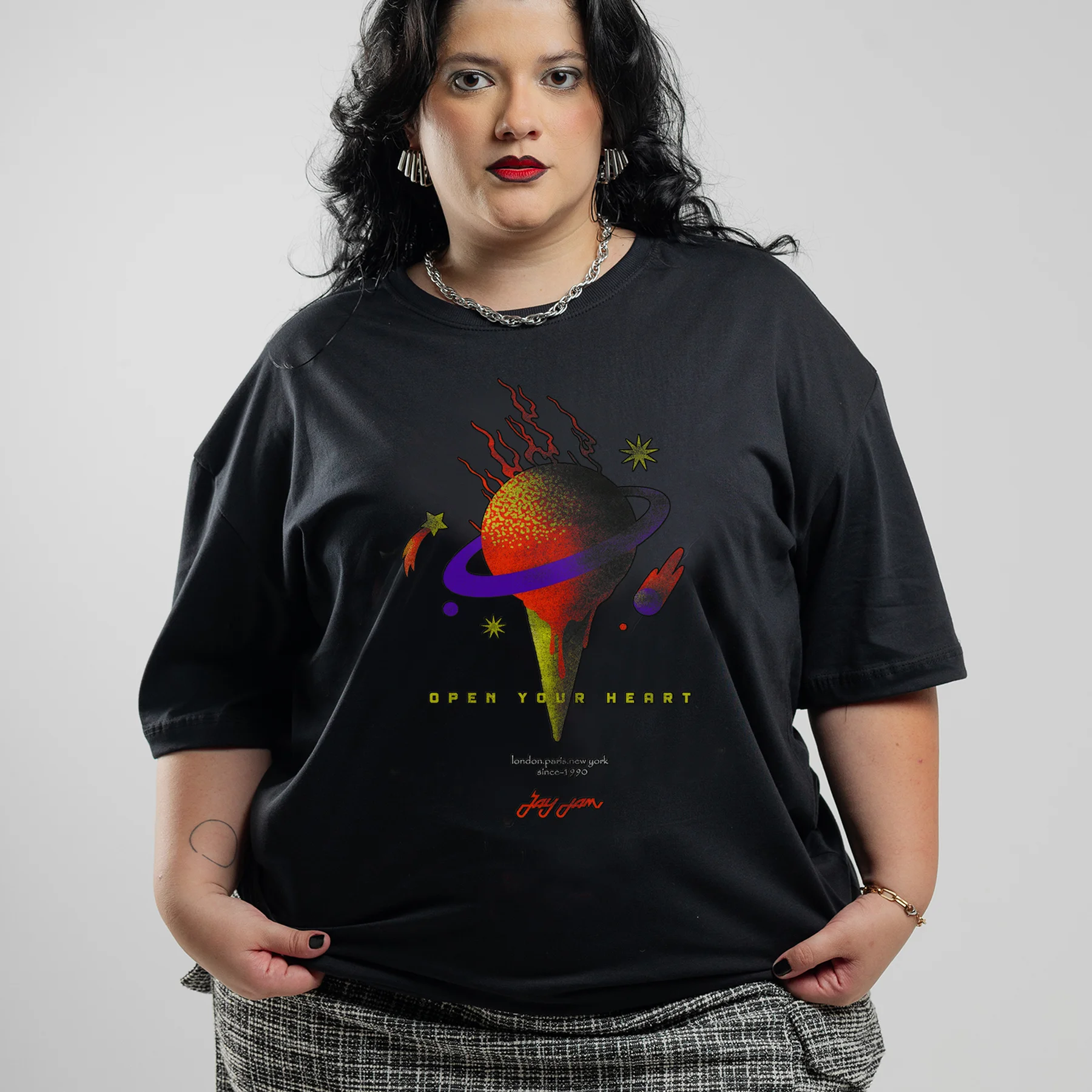 Estampa Exclusiva Jayjam: Coração incandescente com anel planetário, envolto por símbolos espaciais e a frase “OPEN YOUR HEART” em destaque.
