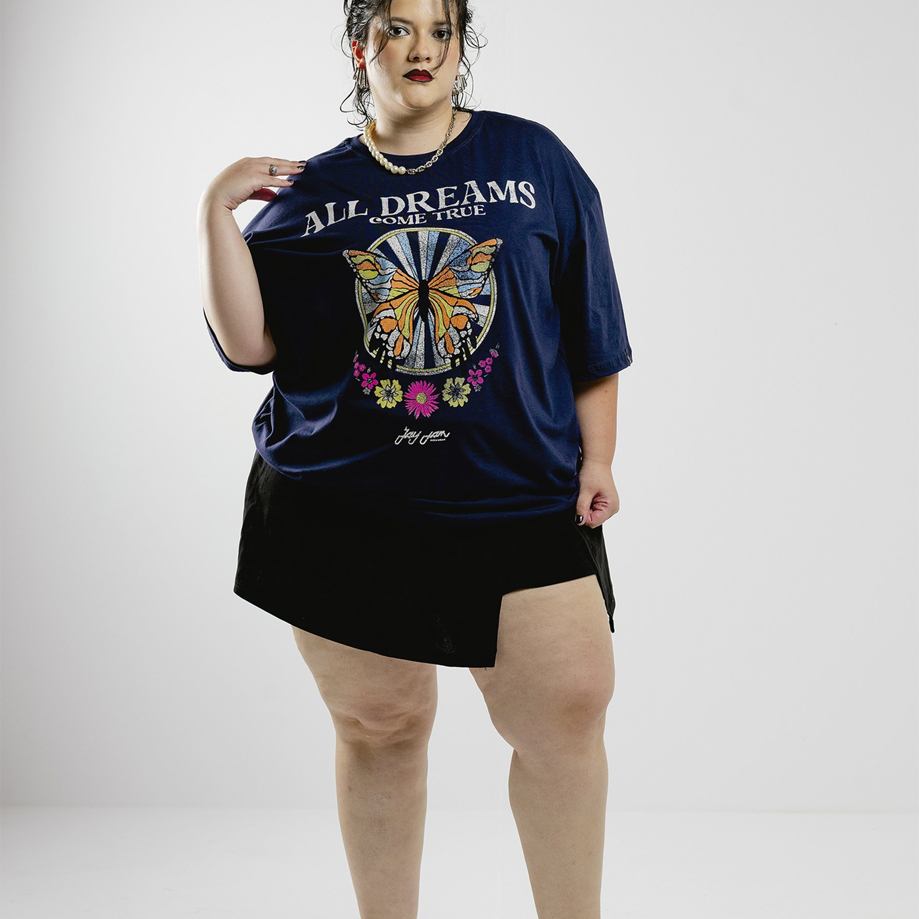 A camiseta oversized All Dreams Come True é perfeita para quem acredita na força dos próprios caminhos. Com estampa de borboleta vintage rodeada por flores e brilho gráfico, essa peça une estilo retrô, conforto e mensagem positiva — a essência da Jayjam Rockwear.