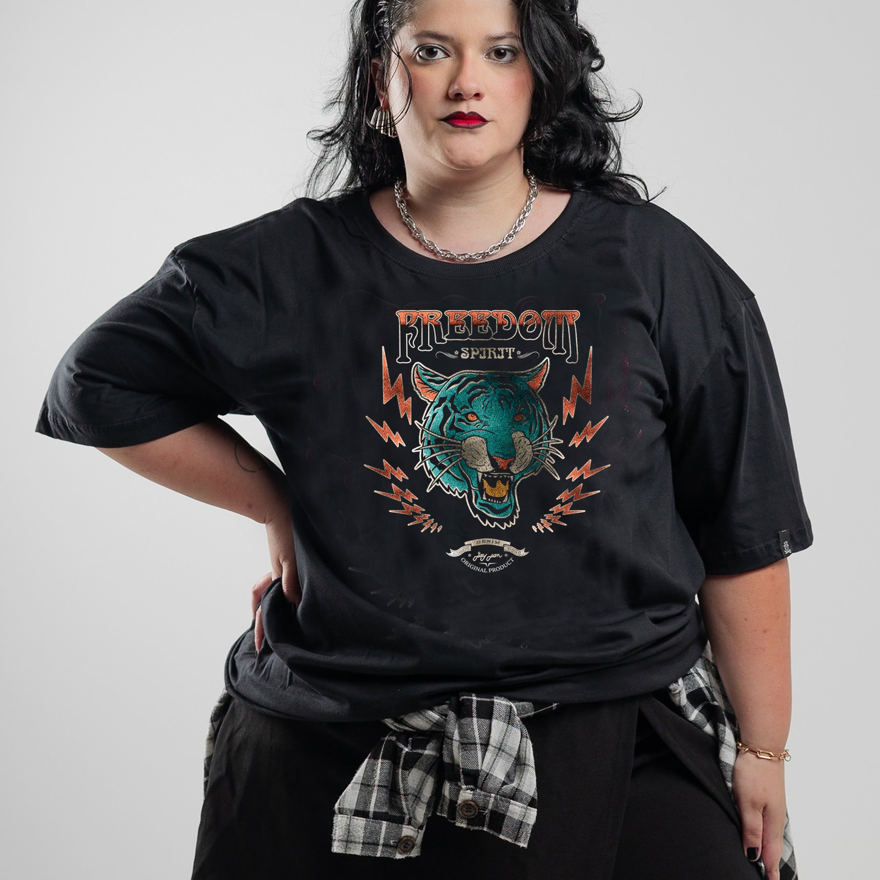 Cor: Preto profundo, que contrasta perfeitamente com a estampa em tons quentes e terrosos, destacando o tigre e garantindo um visual marcante.com a Estampa: A estampa da frase e outros elementos gráficos podem ser em cores como branco, preto ou tons vibrantes, criando um contraste que faz a mensagem se destacar.