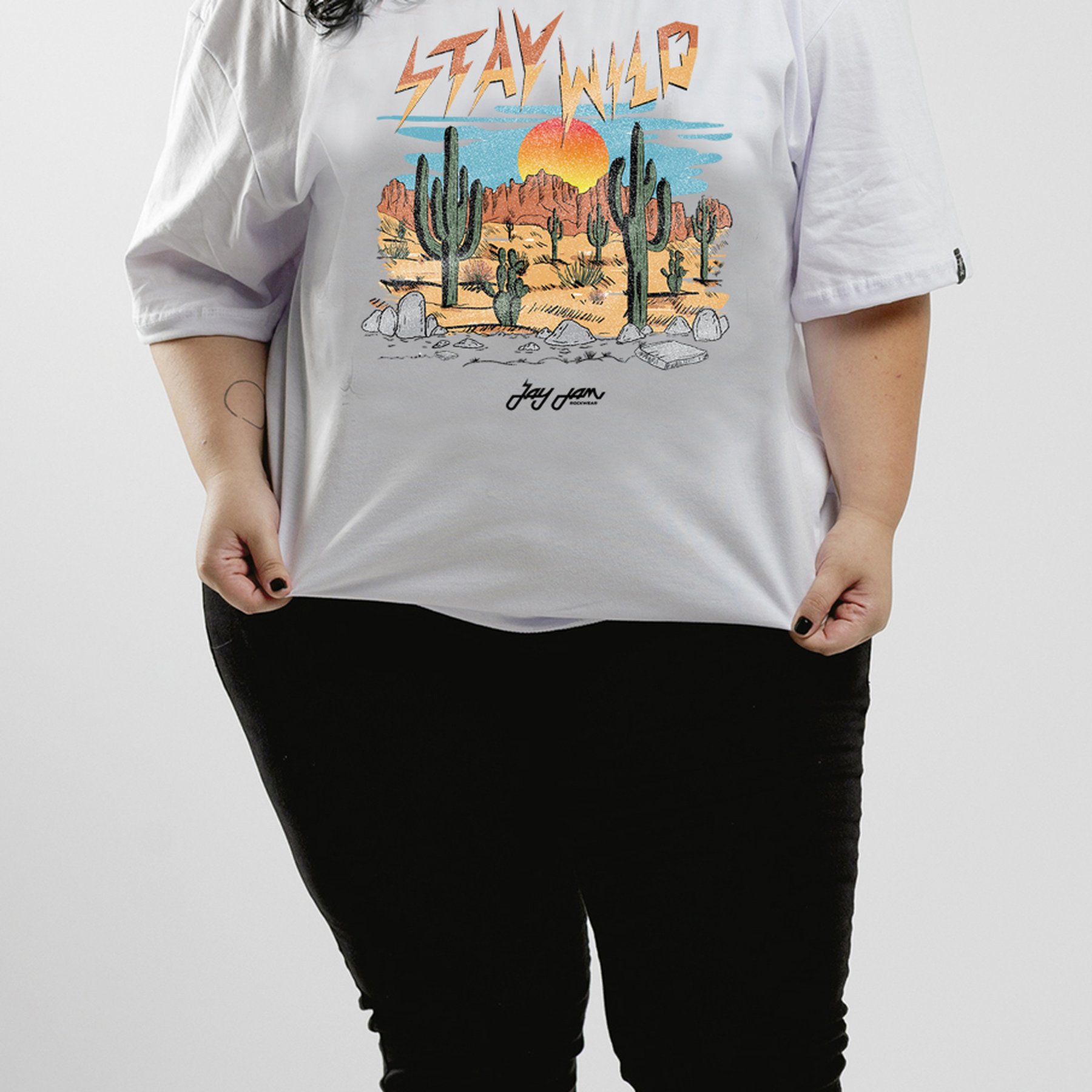 Estampa Exclusiva Jayjam: Paisagem do deserto com cactos, pedras e sol em destaque. A frase “STAY WILD” em fonte marcante finaliza a composição com força e estilo.