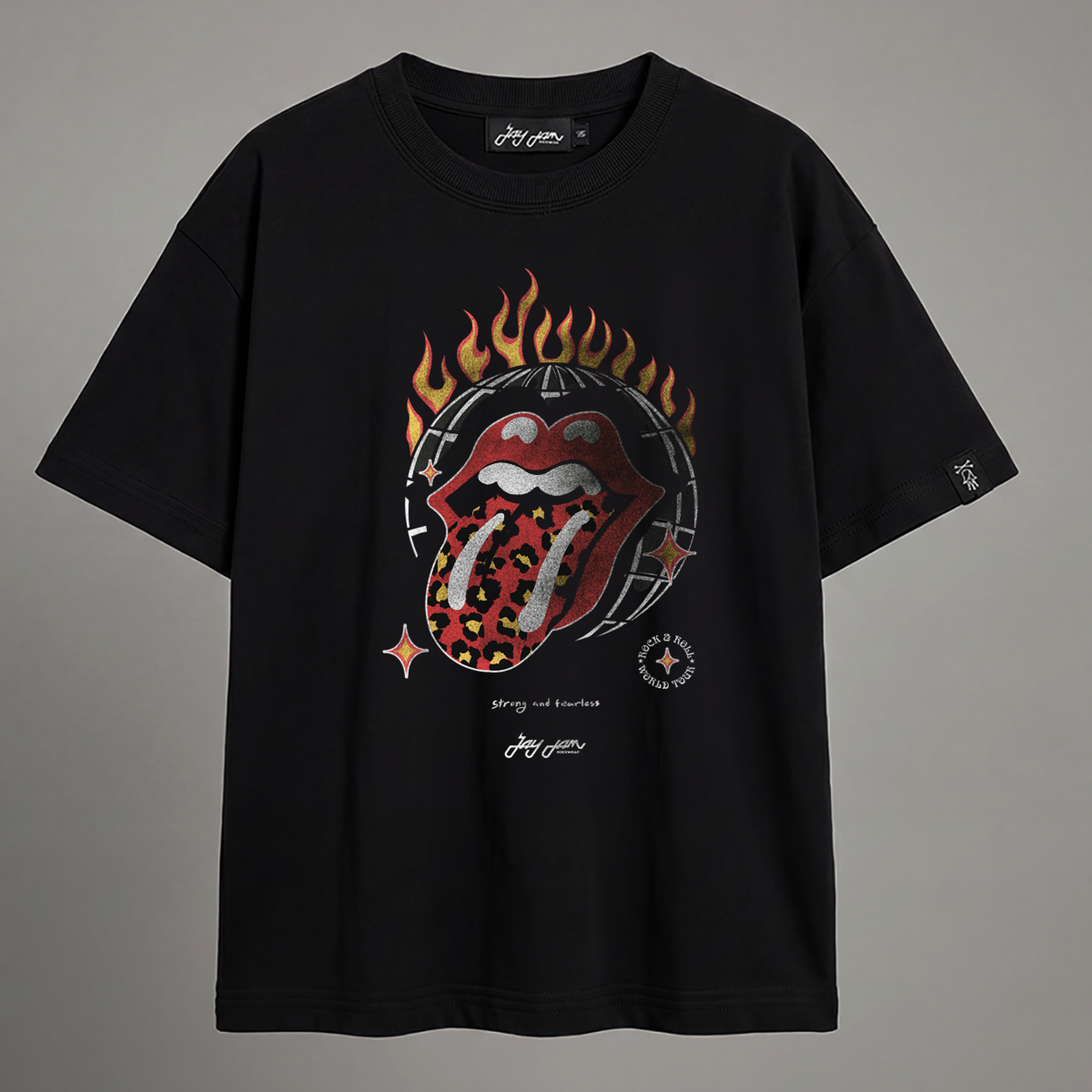 A camiseta oversized Tongue Fire traz a icônica boca com língua estilizada em uma versão cheia de personalidade, com efeito flamejante e detalhes gráficos vibrantes. Uma homenagem visual ao espírito rebelde do rock, com assinatura criativa da Jayjam.