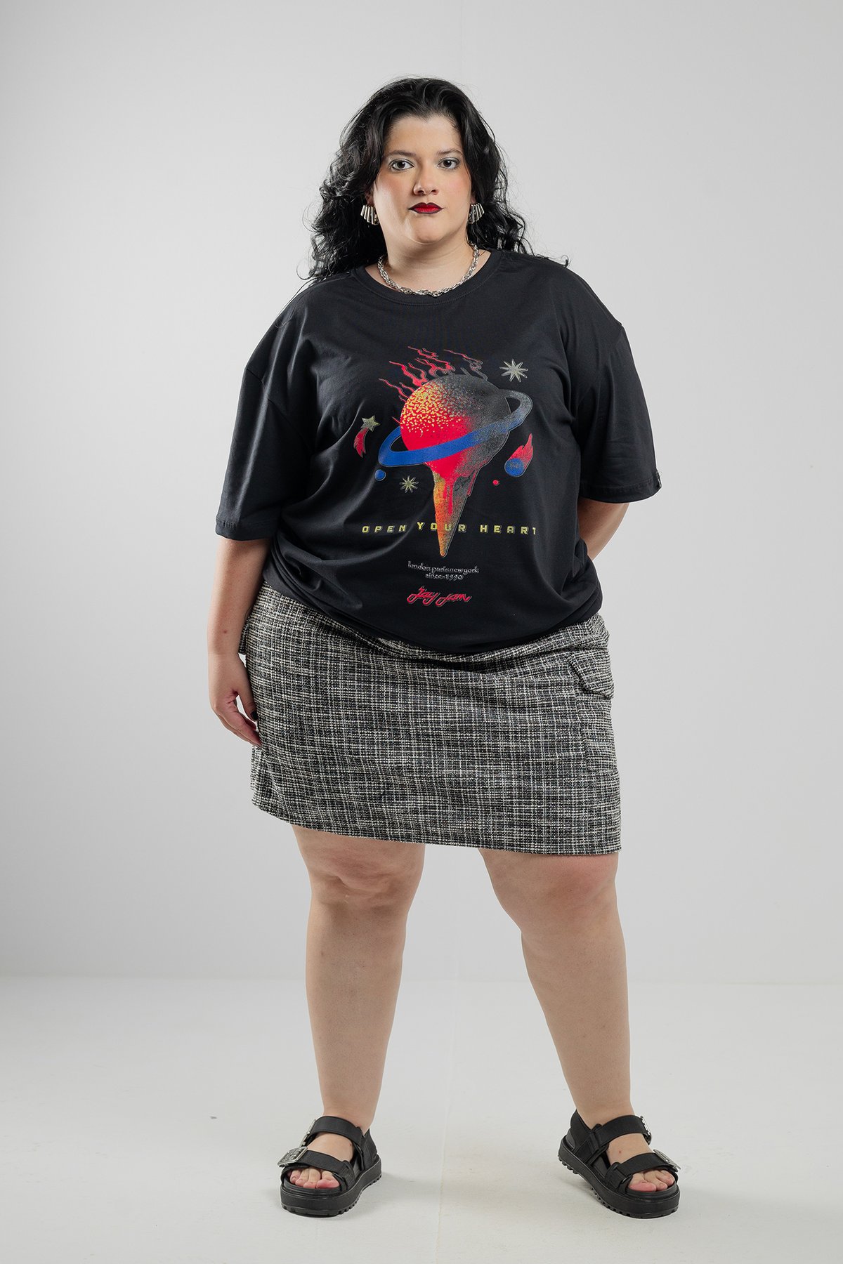A camiseta oversized Open Your Heart combina o surreal com o simbólico. A arte mistura um coração em chamas com elementos cósmicos como planetas, estrelas e órbitas, criando uma estética psicodélica e futurista cheia de significado. Uma peça que transmite intensidade, liberdade