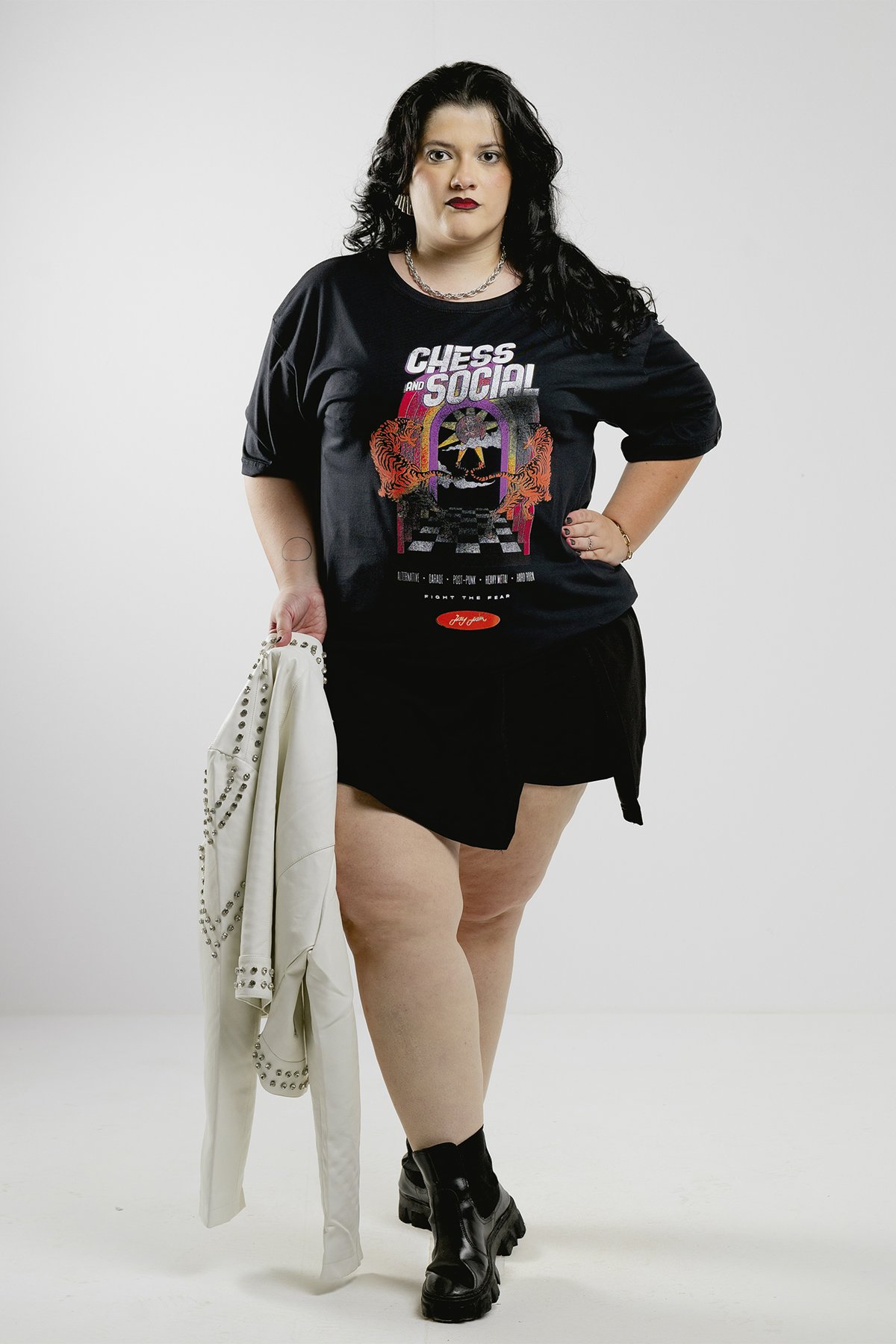 Compor looks estilosos com saia preta, bota tratorada ou jaqueta de spikes. Perfeita para quem vive intensamente e não abre mão da identidade fashion.