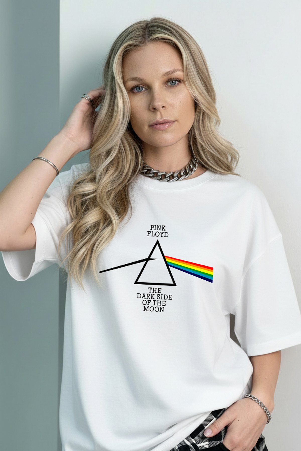 O modelo oversized garante um toque urbano e despojado, ideal para composições versáteis — desde looks casuais até produções mais fashionistas. A estampa central com o prisma e o arco-íris adiciona personalidade e autenticidade à peça, tornando-a indispensável no guarda-roupa de quem ama música e estilo.