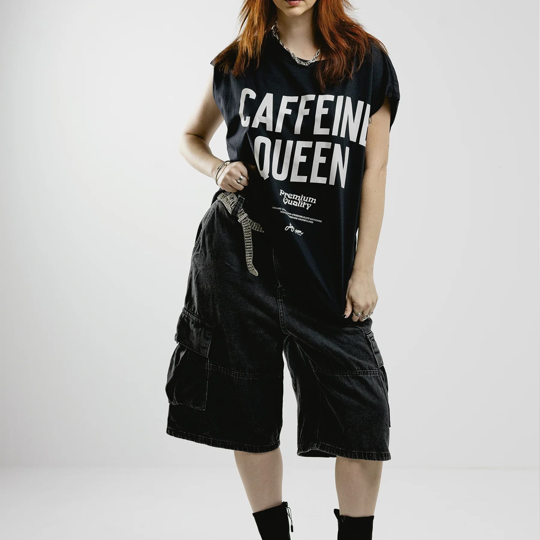 Estampa Exclusiva Jayjam: Frase “CAFFEINE QUEEN” em destaque, com selo “Premium Quality” e assinatura da marca. Arte em branco sobre fundo preto para máximo contraste.