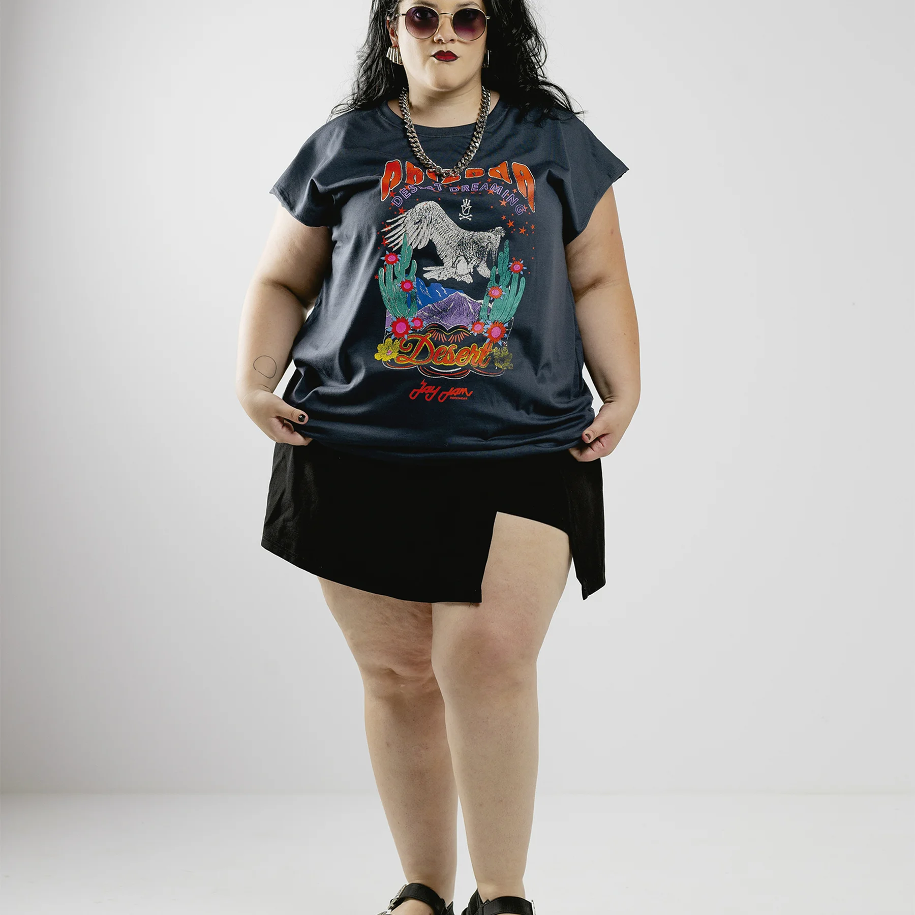 Estampa Exclusiva Jayjam: Com uma águia em voo sobre paisagens áridas, cactos, flores e uma paleta vibrante, a peça é um manifesto de liberdade, atitude e conexão com o selvagem.