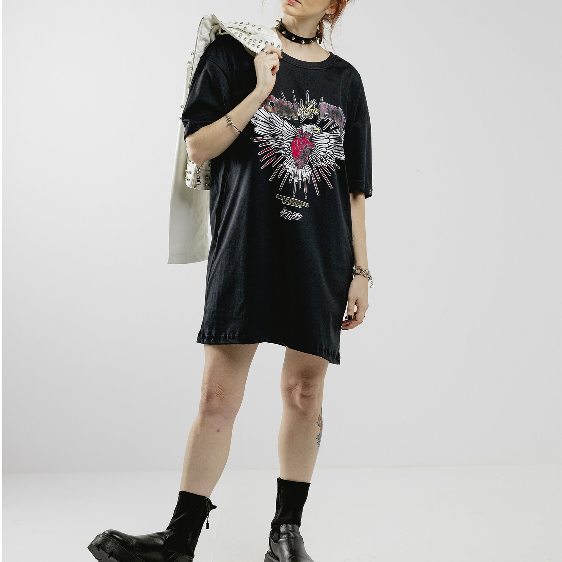 O vestido oversized “Born Some Noise Free” da Jayjam traduz a essência do rock com uma arte poderosa: coração alado com explosões de estilo e emoção
